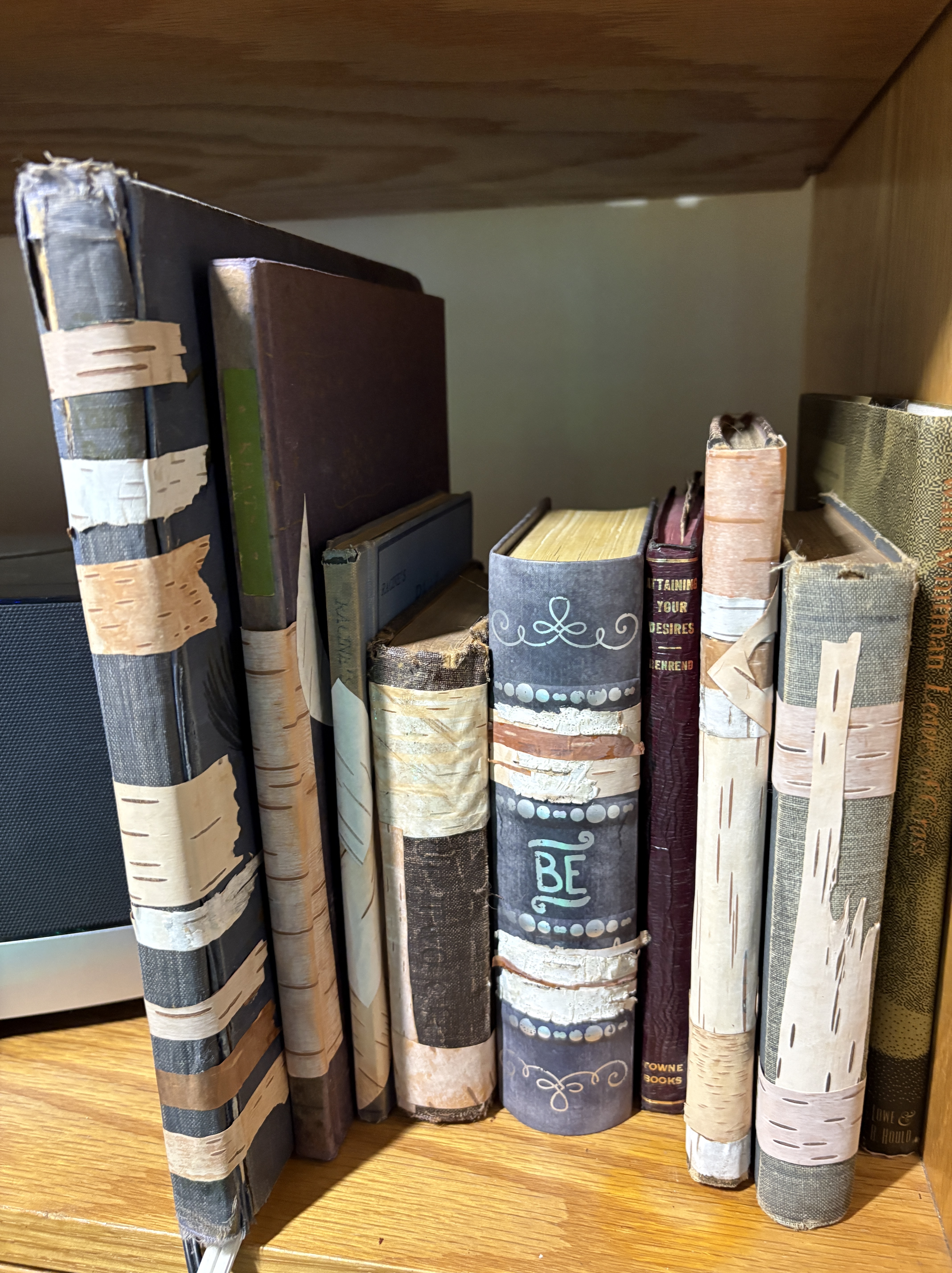 For years, many of these books sat unnoticed on my living room built-in shelves. After their birch transformations, people now cross the room to look more closely at them. They cradle one gingerly and open the pages and read a bit aloud. Suddenly these books are alive again, breathing and inspiring. It feels like book rescue more than book repair.