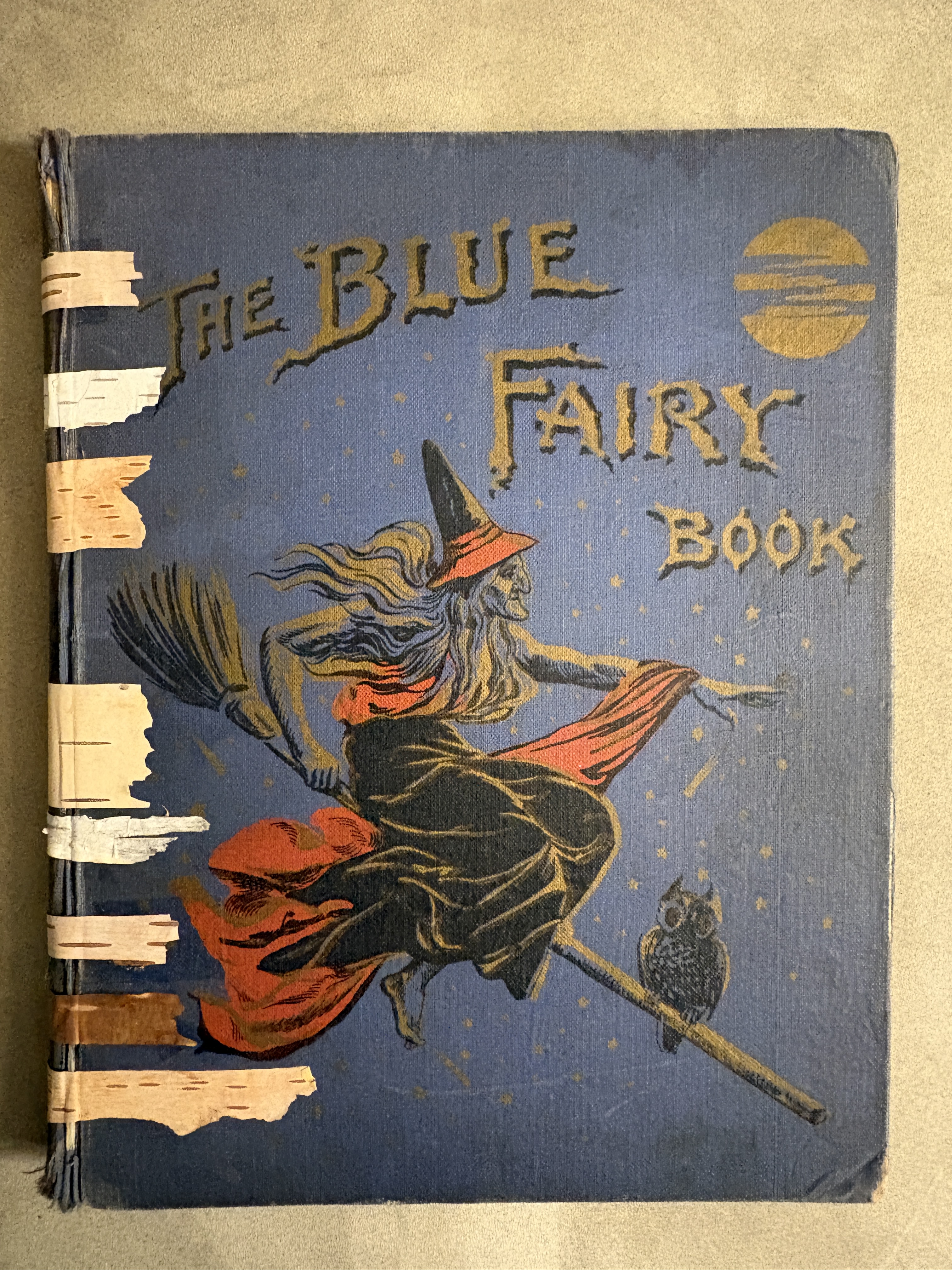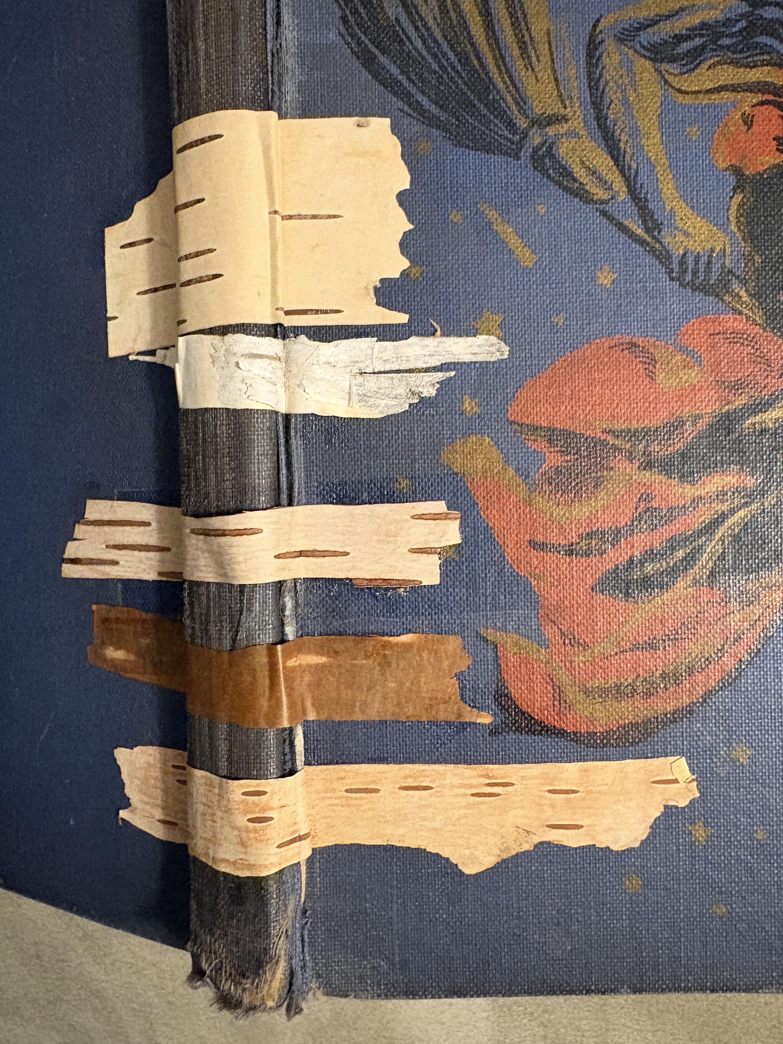 My first birched-book (beyond the many blank journal covers I’ve decorated for myself and fellow writers) was “The Blue Fairy” that I found in a neighborhood Free Library, well loved and falling to pieces. The glossed, finely detailed color-illustrations announced that this was a treasure, even without its cover, and I was tempted to take it apart to frame the art. Instead I tried my hand at a stylized repair job using nature’s early form of paper: birch bark.